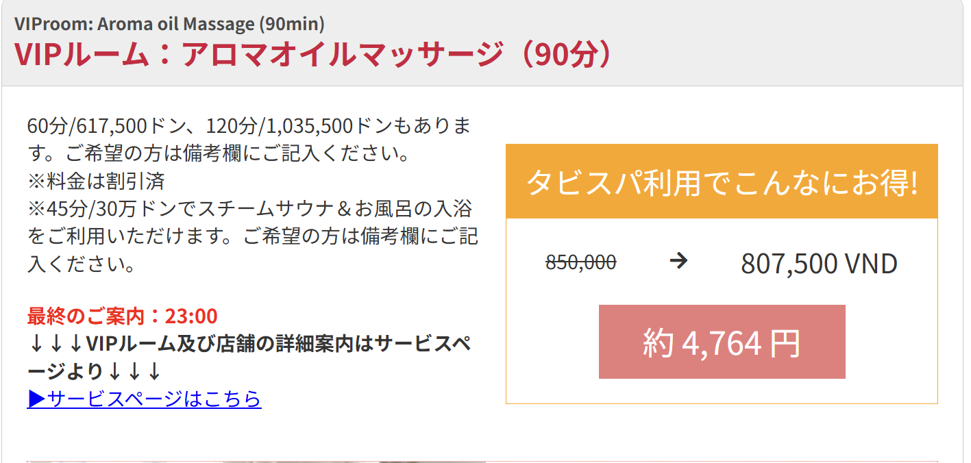 注意点は、「VIPルーム:〇〇」はあくまでもVIPルームの利用のみとなるので、部屋の中のスチームサウナやお風呂の入浴はご利用できません。こちらを利用希望の場合は、追加で30万ドン/人を払うことで、45分間利用できます。
