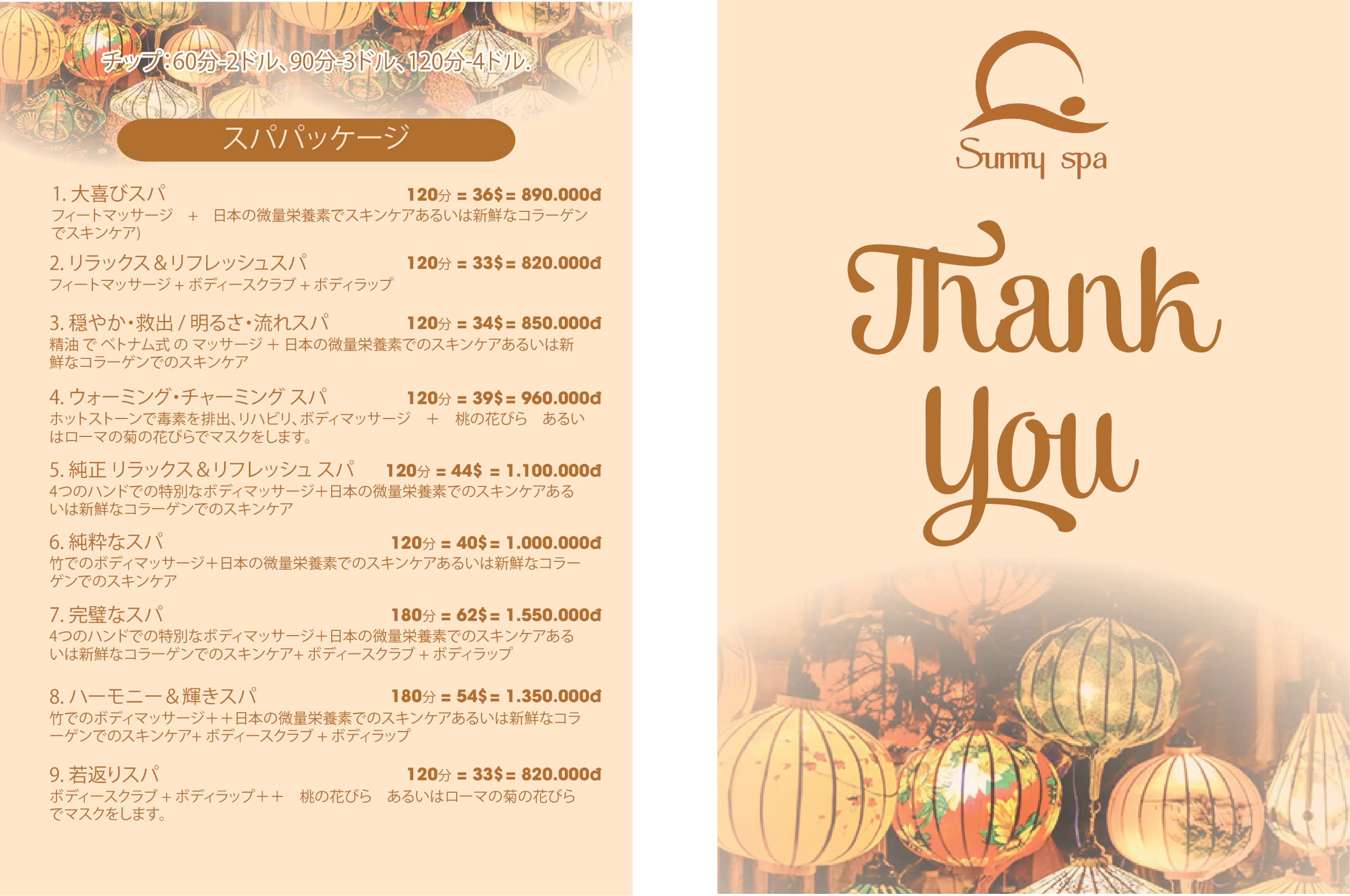 メニューにも日本語と英語でスパの内容が事細かにされているので、じっくりと内容を把握することができます。チップ込みでも30分のマッサージだけだと約1,000円〜受ける事ができ、お財布にも優しいです。カード払いは勿論のこと、ベトナムドン以外にもドルと円での支払いを受け付けています。